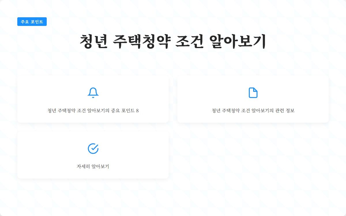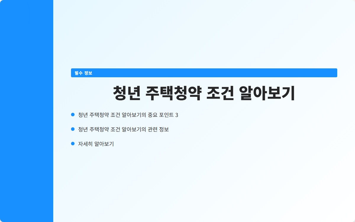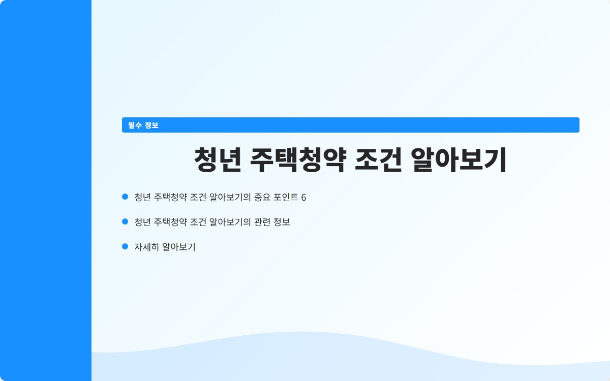 청년 주택청약은 많은 청년들이 처음으로 집을 마련할 수 있는 기회로, 많은 관심을 받고 있습니다. 하지만 청약을 신청하기 위해서는 여러 가지 조건을 충족해야 합니다. 이번 포스트에서는 청년 주택청약의 조건에 대해 자세히 알아보겠습니다.