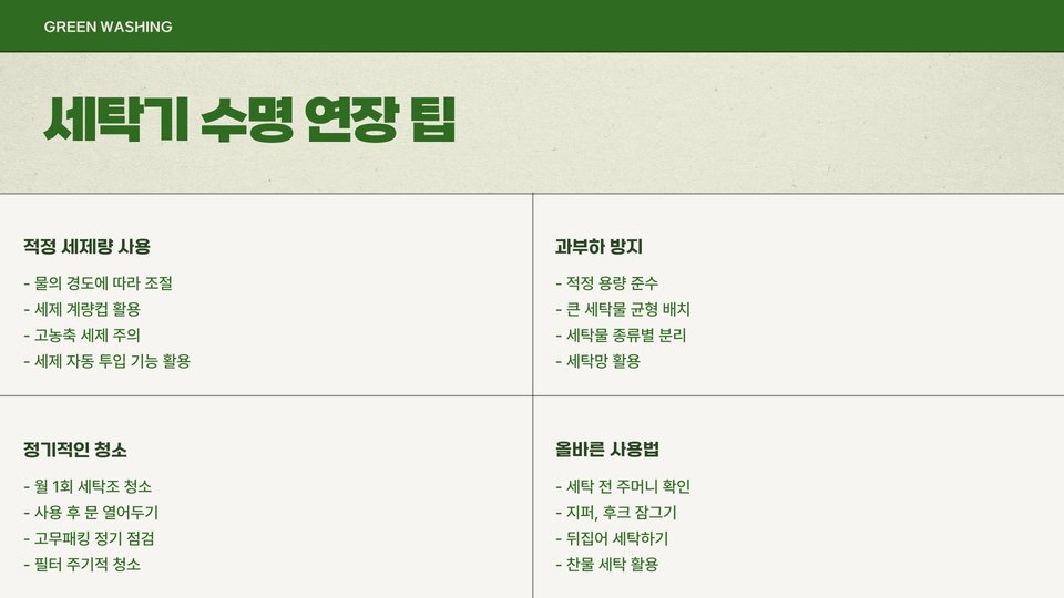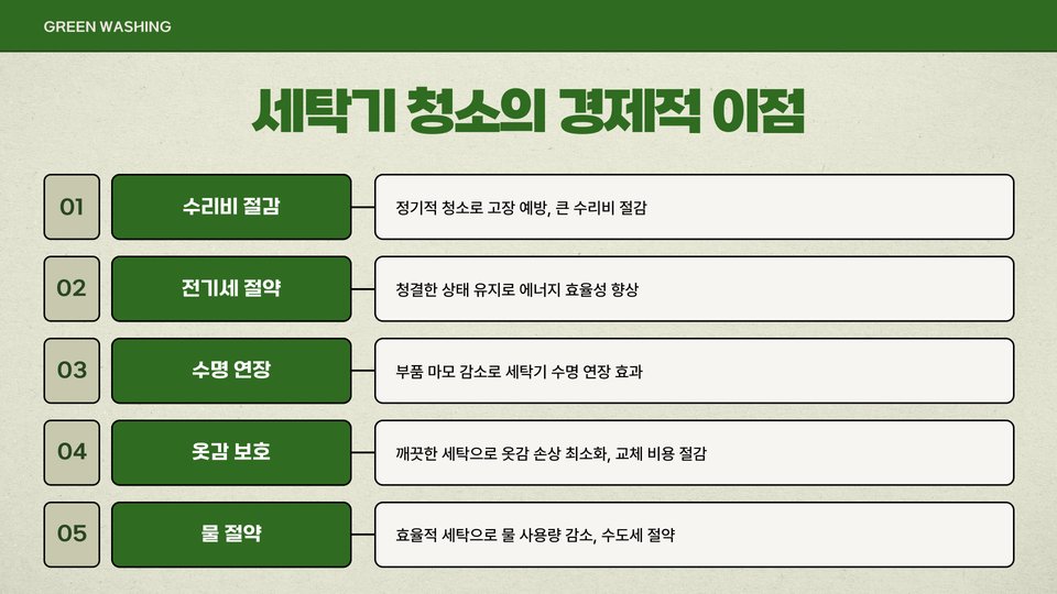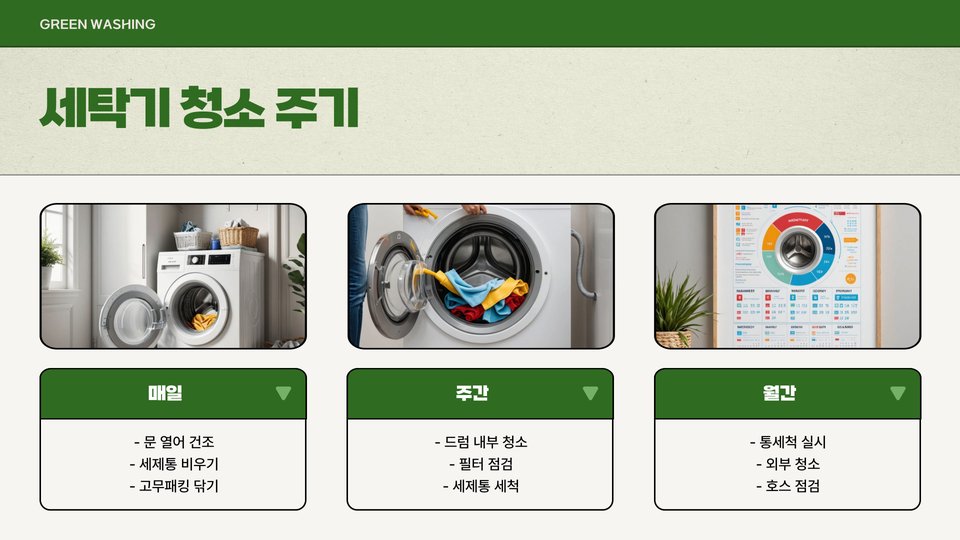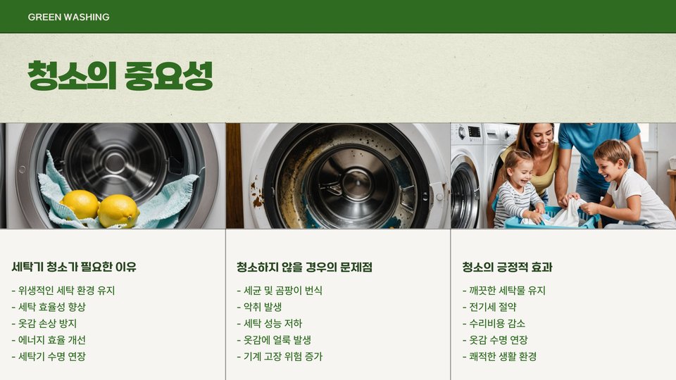 - 세탁기 수명 연장: 정기적인 유지보수는 기계의 수명을 늘려줍니다.