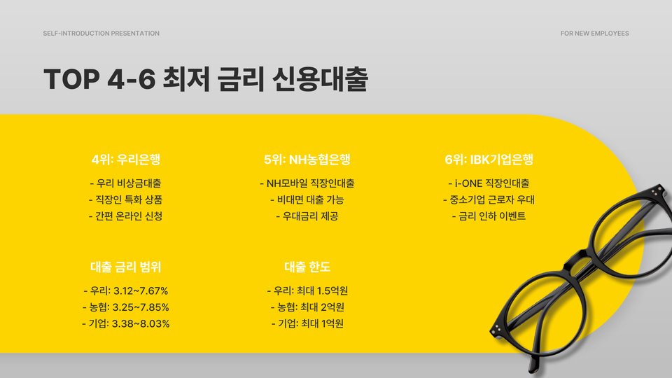 - 우리은행: 최저 금리 3.3%, 최대 대출 한도 6천만 원.