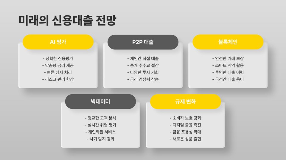 신용등급은 개인의 대출 조건 뿐만 아니라 이자율에도 큰 영향을 미치므로 자신의 신용관리를 잘하는 것이 중요합니다. 대출 상환 방법이나 기간도 대출 금리에 영향을 줄 수 있으므로, 다양한 상품을 비교 분석해서 자신에게 가장 적합한 대출 상품을 선택하는 것이 필요합니다.