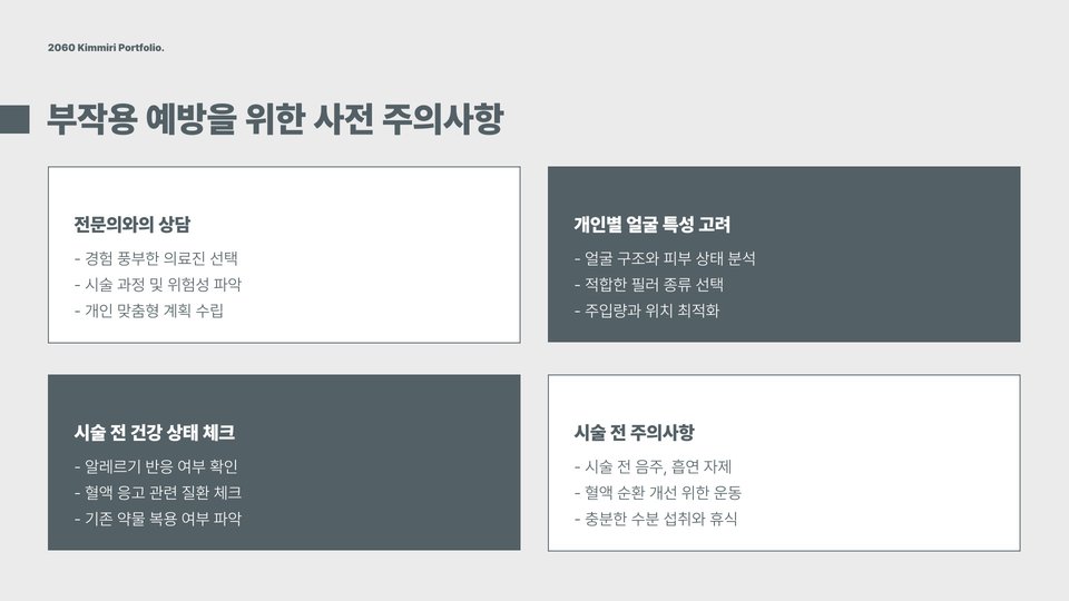 부작용이 발생했을 때는 전문가의 상담을 받는 것이 중요합니다. 피부과 전문의나 성형외과 의사는 개인의 피부 상태와 부작용 정도에 따라 적절한 처치를 제공할 수 있습니다. 또한, 사전에 충분한 상담을 통해 자신에게 맞는 시술 방법을 선택하는 것이 부작용을 줄이는 데 큰 도움이 됩니다.