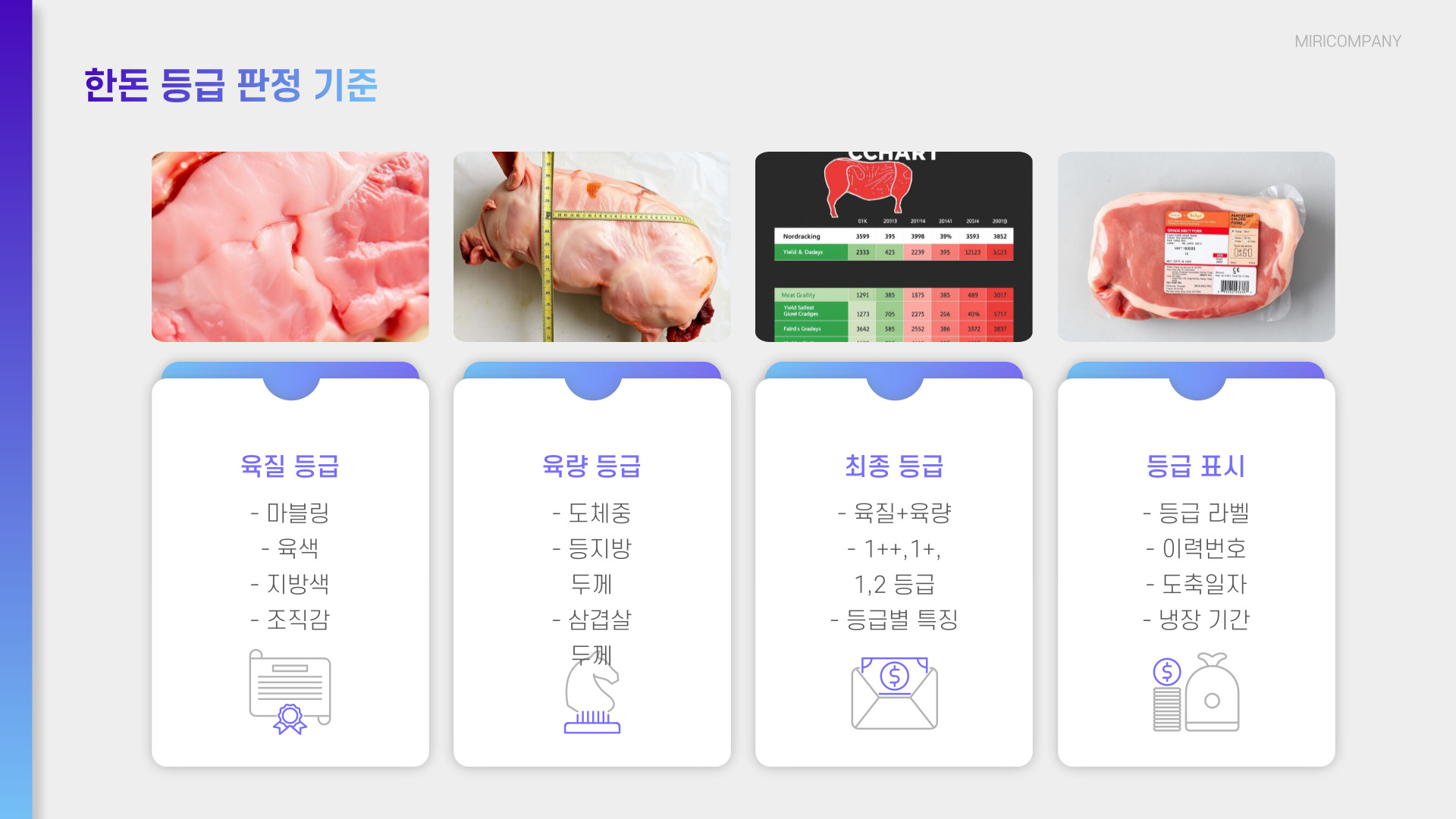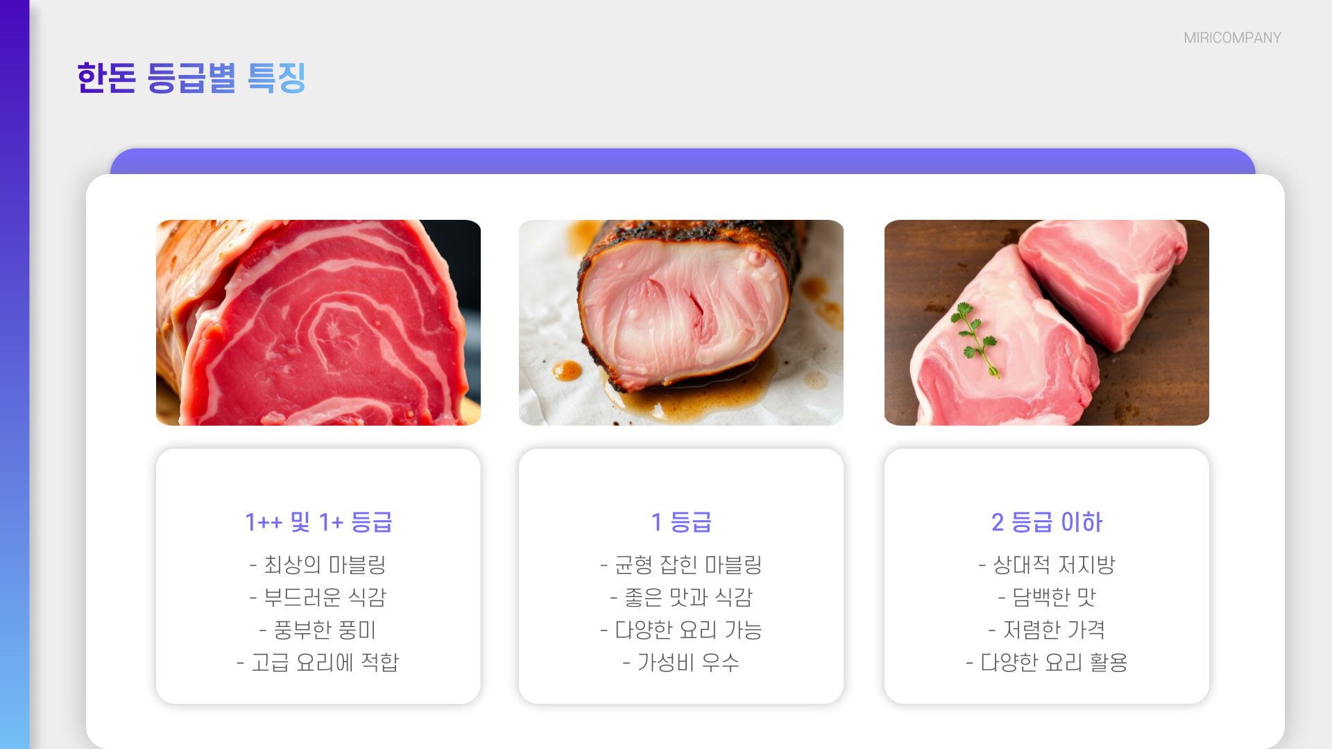 한돈 등급은 소비자가 고기를 선택할 때 가장 기본적인 기준 중 하나입니다. 이 등급은 고기의 품질, 맛, 지방 함량 등을 기준으로 결정됩니다. 한돈의 등급은 크게 1++등급, 1+등급, 1등급, 2등급, 3등급으로 나뉘며, 등급이 높을수록 더 부드럽고 풍미가 뛰어난 고기를 의미합니다. 따라서 고기를 선택할 때 자신의 취향과 요리에 맞는 등급을 선택하는 것이 매우 중요합니다.