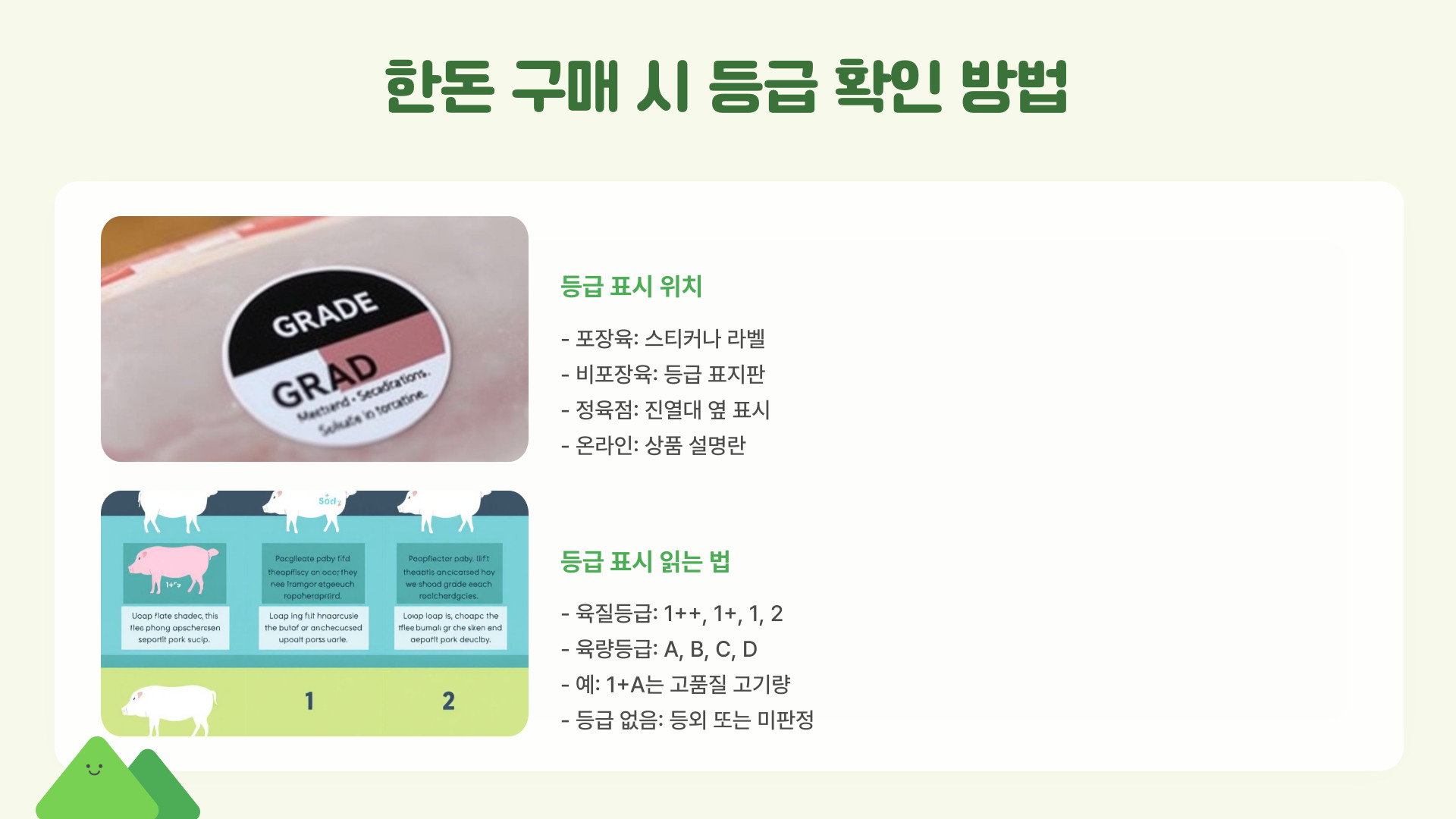 - 한돈은 1등급, 2등급, 3등급으로 나뉘며, 등급이 높을수록 품질이 뛰어납니다.