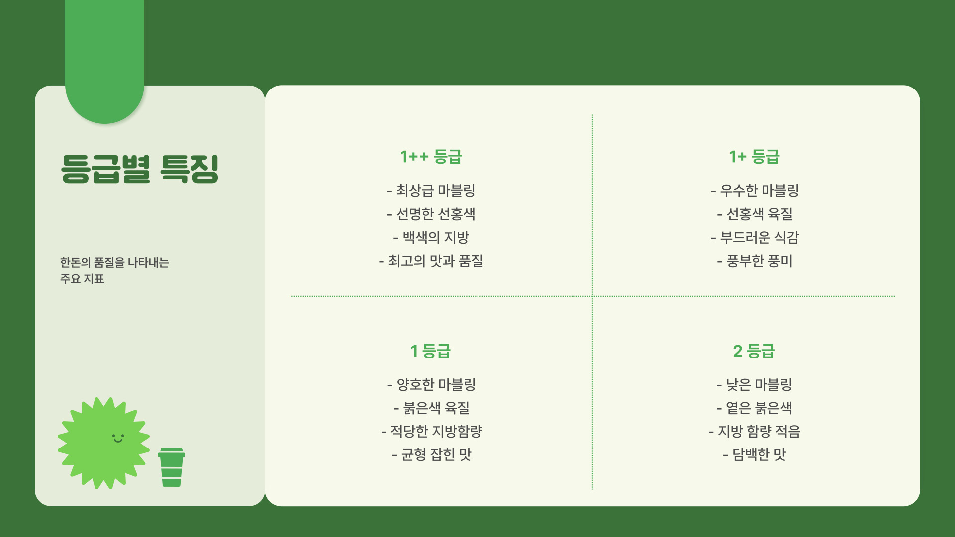 한돈 등급은 고기의 품질을 평가하기 위한 기준으로, 일반적으로 세 가지 등급으로 나누어집니다: 特급(Best), 우수(Excellent), 보통(Good). 이 등급은 마블링, 육색, 조직감 등을 종합적으로 고려하여 결정됩니다. 마블링은 고기 속 지방의 분포를 의미하며, 잘 분포된 마블링은 고기의 풍미와 육즙을 증가시킵니다.