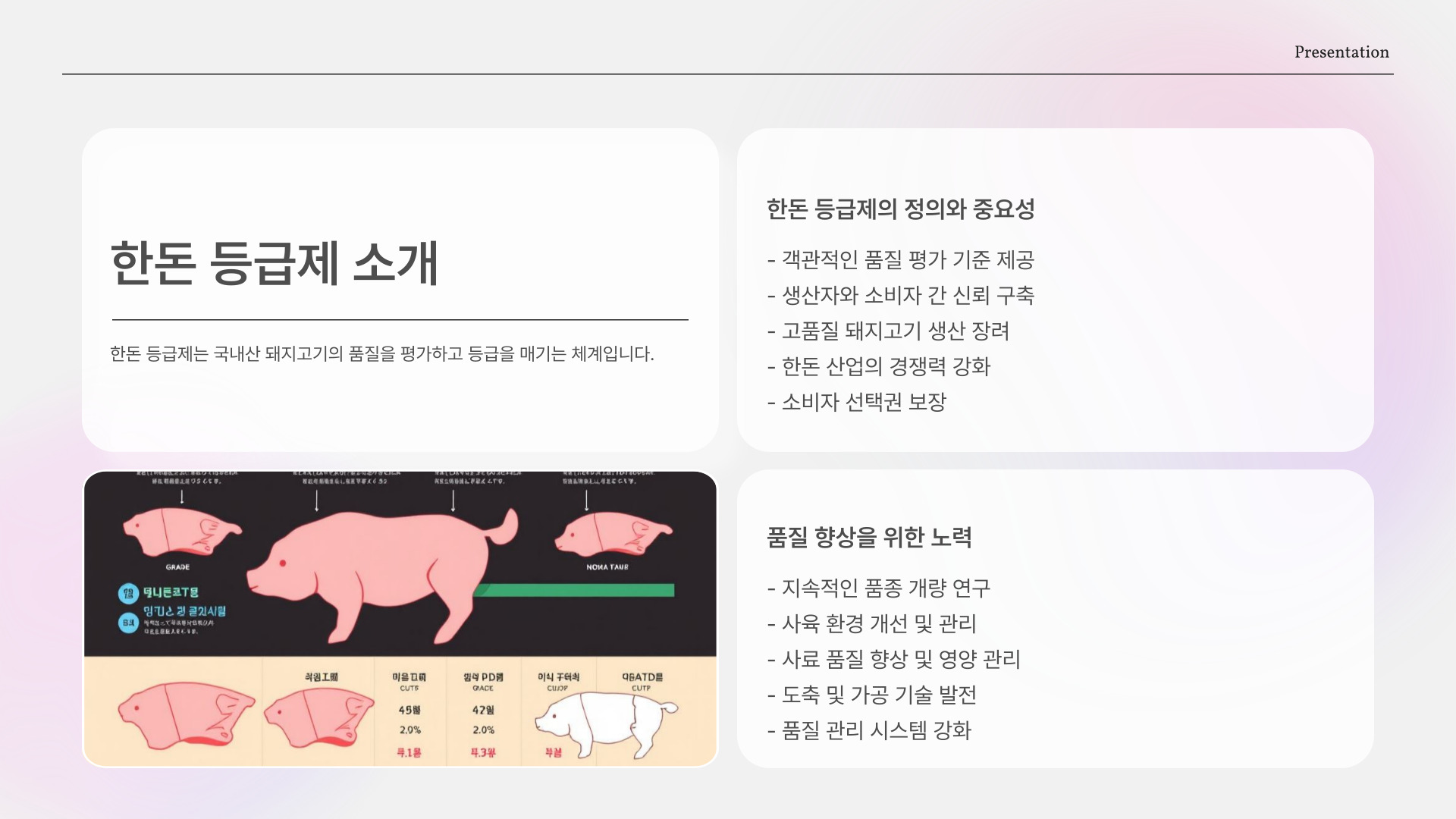- 한돈 등급은 주로 육질, 지방 분포, 색깔로 평가된다.