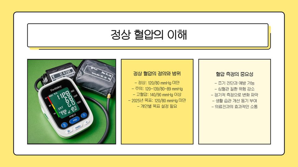 정상 혈압을 유지하기 위해서는 정기적인 건강 검진이 필수입니다. 자신의 혈압 상태를 정확히 아는 것이 중요하며, 주기적인 측정을 통해 위험 요소를 사전에 파악할 수 있습니다.