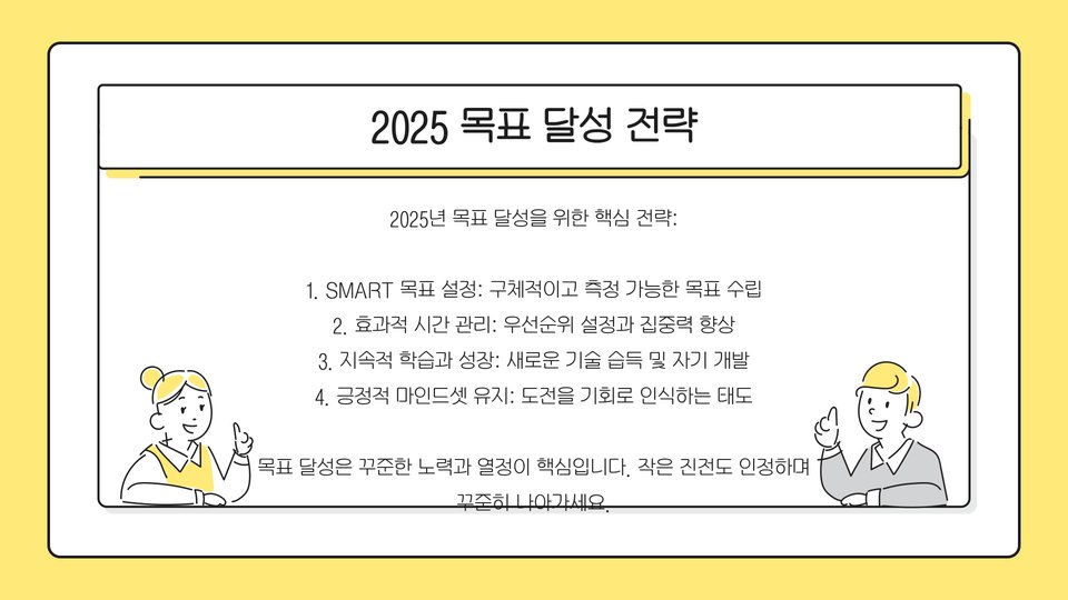 2025년이 다가오면서 다가오는 목표들은 물론이고, 목표를 달성하기 위한 전략이 중요합니다. 목표가 멀어 보일지라도, 올바른 계획과 지속적인 점검, 동기 부여가 함께한다면 흔들림 없이 나아갈 수 있습니다. 목표 달성을 위한 길은 험난할 수 있지만, 과정 속에서 얻는 경험들은 더할 나위 없는 자산이 될 것입니다. 따라서 개인의 목표를 향해 끈기 있게 나아가기를 바랍니다.