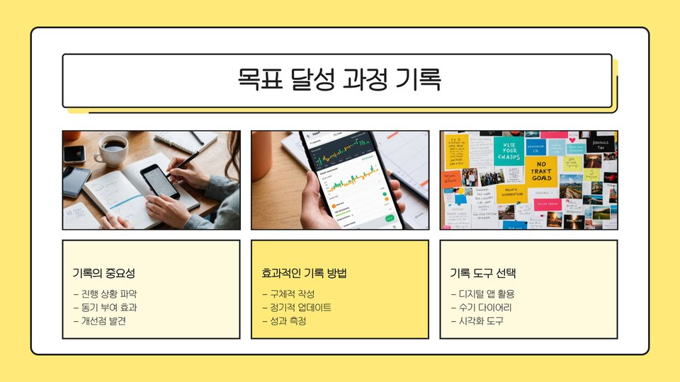 목표를 향해 나아가고 있다면, 진행 상황 점검이 필수적입니다. 목표는 가끔 도중에 조정이 필요할 수도 있습니다. 매주, 또는 매달 정해진 시간에 목표의 진행 상황을 점검하는 습관을 들이는 것이 중요합니다. 이런 점검은 자신이 얼마나 나아갔는지를 확인하고, 필요한 경우 계획을 수정하는 데 도움을 줍니다.