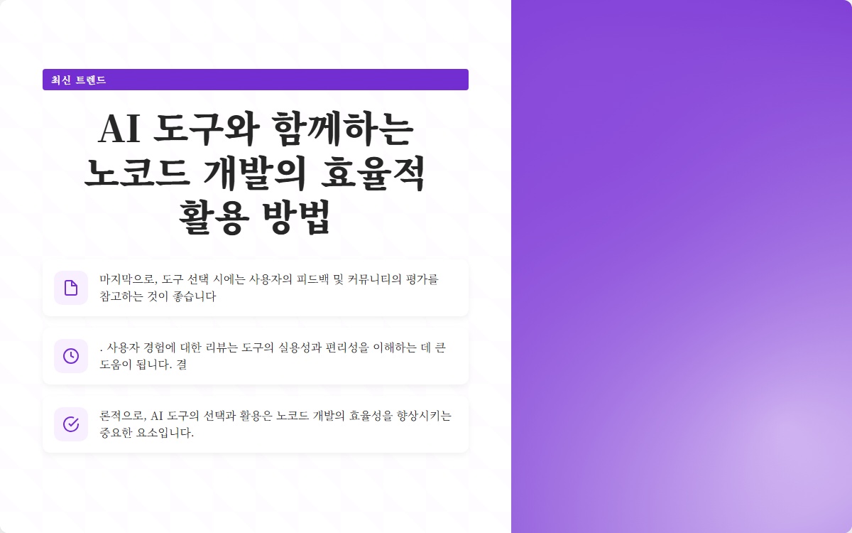 마지막으로, 도구 선택 시에는 사용자의 피드백 및 커뮤니티의 평가를 참고하는 것이 좋습니다. 사용자 경험에 대한 리뷰는 도구의 실용성과 편리성을 이해하는 데 큰 도움이 됩니다. 결론적으로, AI 도구의 선택과 활용은 노코드 개발의 효율성을 향상시키는 중요한 요소입니다.