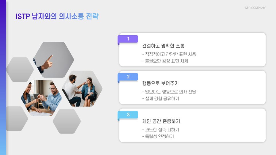 또한, ISTP 남자와의 대화에서는 실질적이고 구체적인 주제로 대화하는 것이 좋습니다. 감정적인 주제보다는 그들이 관심을 가질 만한 활동이나 사실에 대한 이야기를 나누는 것이 효과적입니다. 그들의 관심사를 존중하고, 그들이 좋아하는 활동에 함께 참여하는 것도 좋은 방법입니다.