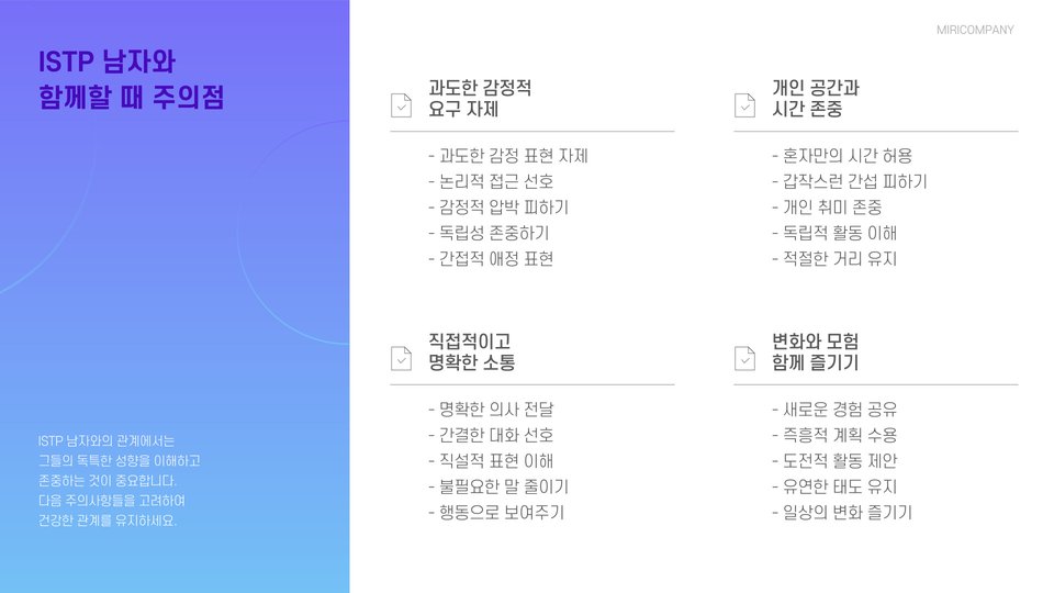 또한, ISTP 남자와의 대화에서는 실질적이고 구체적인 주제로 대화하는 것이 좋습니다. 감정적인 주제보다는 그들이 관심을 가질 만한 활동이나 사실에 대한 이야기를 나누는 것이 효과적입니다. 그들의 관심사를 존중하고, 그들이 좋아하는 활동에 함께 참여하는 것도 좋은 방법입니다.