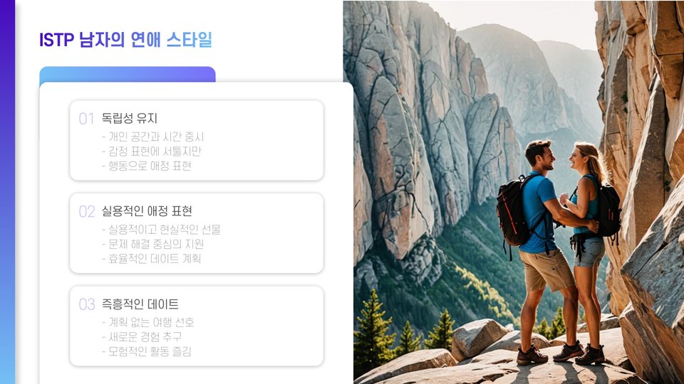 이런 성향 때문에 종종 ISTP 남자는 감정 표현에서 부족함을 느끼는 파트너에게 실망을 안길 수 있습니다. 다양한 경험을 공유하고, 새로운 활동을 통해 관계의 깊이를 더욱 더할 수 있는 방법을 모색하는 것이 중요합니다. 여행이나 아웃도어 활동은 그와의 관계를 더욱 돈독히 해줄 수 있습니다. ISTP 남자의 모험적인 성향이 드러날 수 있는 경우이기도 합니다.