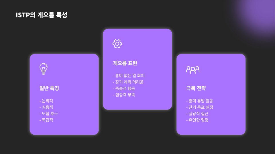 - ISFP: 자유로운 영혼을 지닌 이들은 가끔 즉흥적으로 행동하지만, 장기적인 목표 설정에 약합니다.