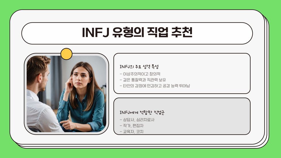 Tags: MBTI, 직업 추천, 성격 유형, 직업 만족도, 커리어 개발, 전문가 추천, 업무 환경, 스트레스 수준, 행복한 직장 생활, 개인적 성장
