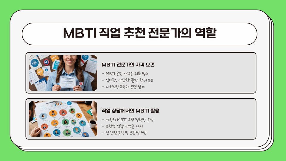 이 글을 통해 MBTI 직업 추천 전문가들의 선택 기준과 이유를 이해하고, 여러분의 직업 선택에 있어 도움이 되기를 바랍니다. 더 나은 직업 선택을 위해 MBTI를 활용해 보세요!