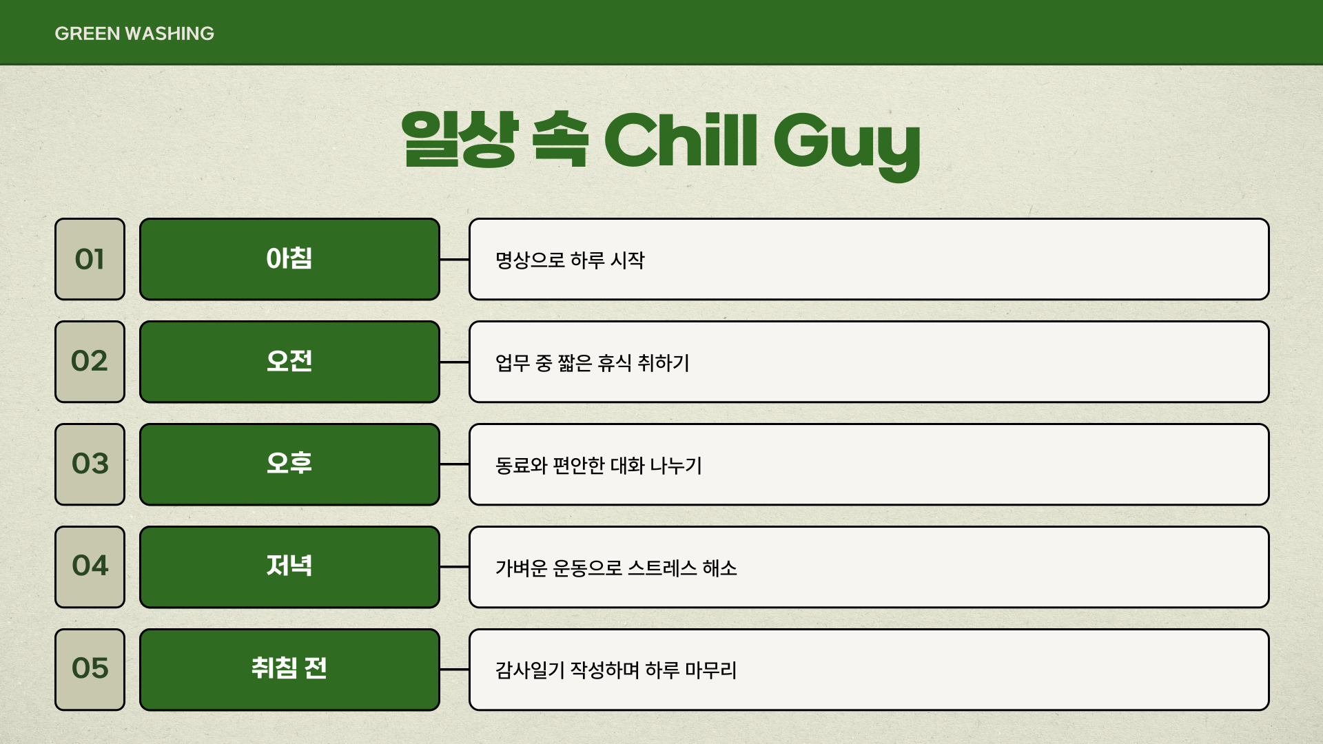 - 일상에서 chill guy 밈을 적용해 보자.