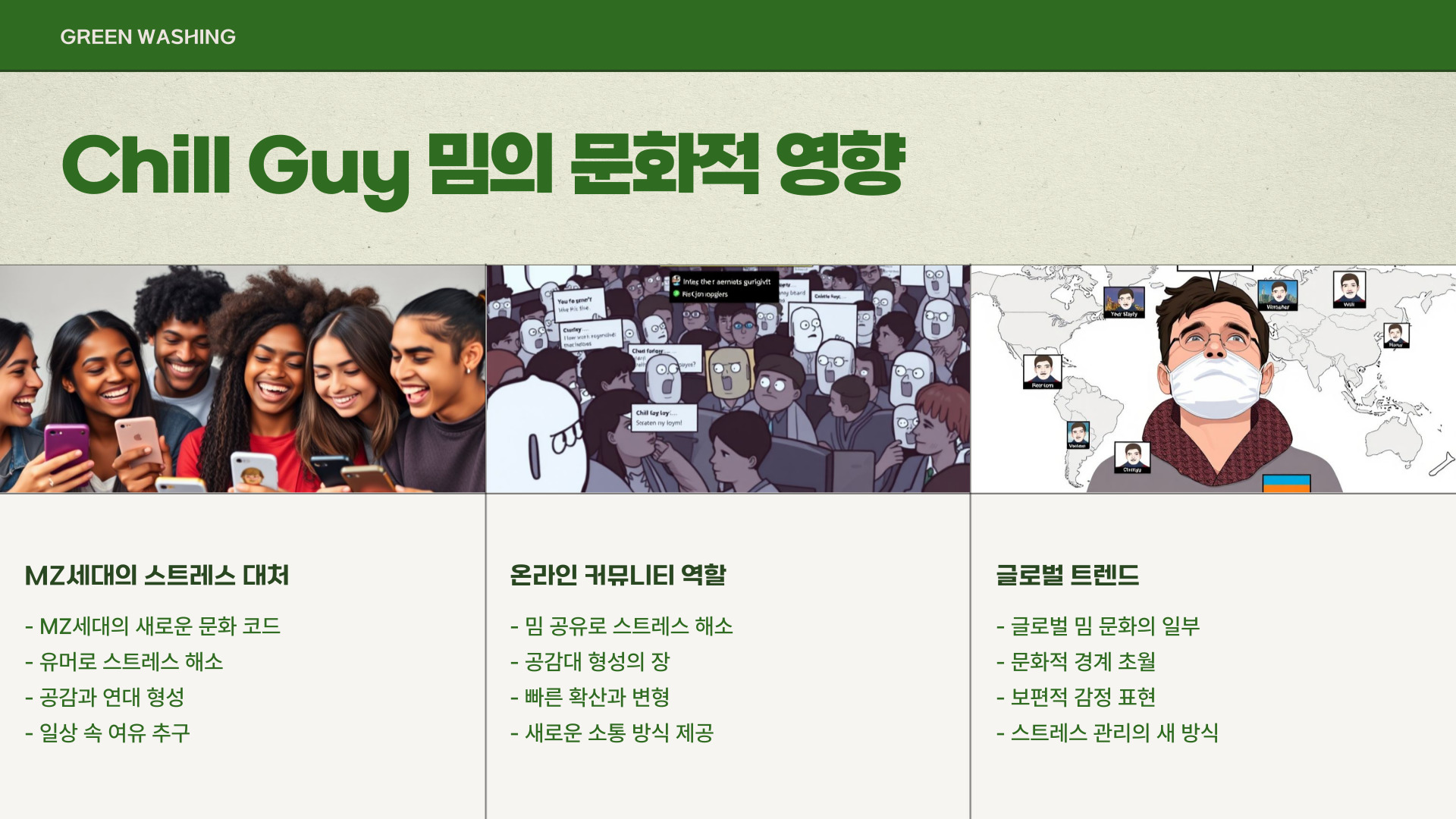 - chill guy 밈은 스트레스를 유머로 풀어내는 데 도움을 준다.