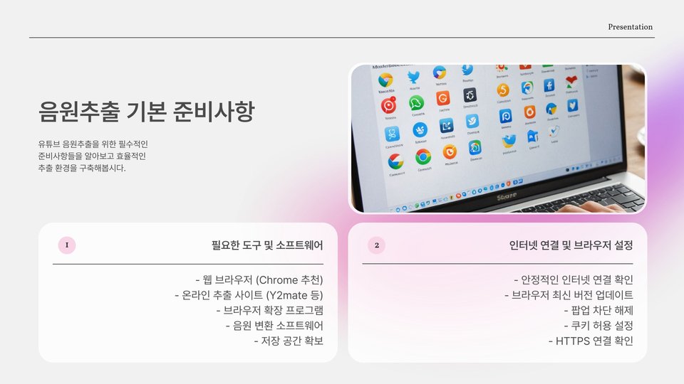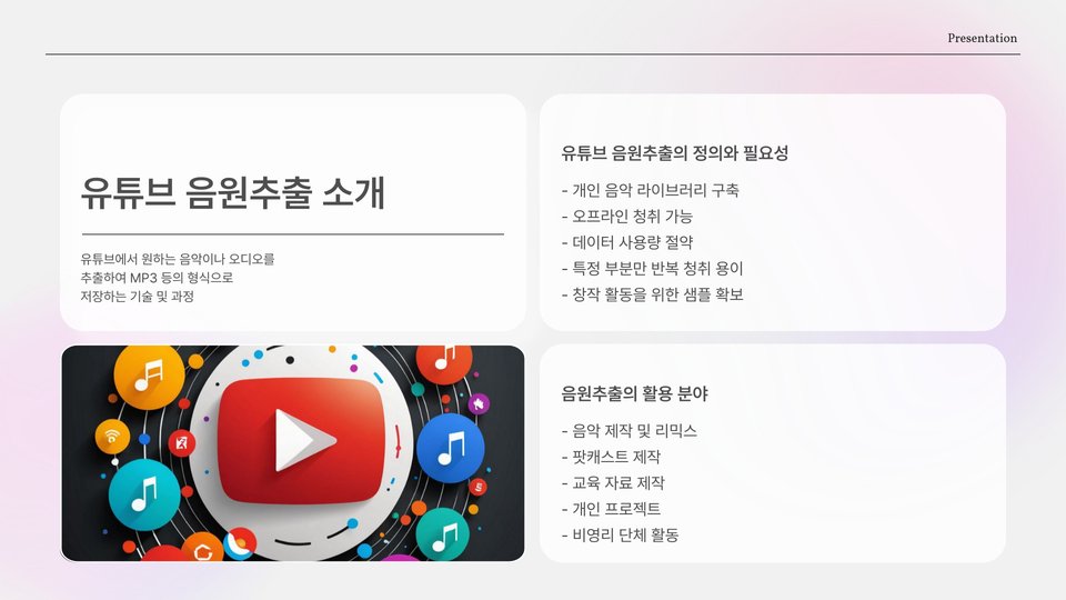 유튜브 음원추출이란, 유튜브에서 제공하는 동영상에서 오디오 트랙을 분리하여 활용 가능한 형태로 변환하는 과정을 의미합니다. 보통은 음악을 듣거나 배경 음악을 제작 시 사용하게 됩니다. 이 과정을 통해 동영상 콘텐츠의 음성을 보다 쉽게 가져올 수 있습니다. 유튜브 음악 이용 시 유용한 툴이 많이 있지만, 적법한 경로를 통해 사용하는 것이 중요합니다.