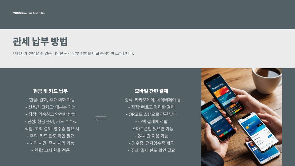 세 번째 단계는 세금 납부입니다. 신고서 제출 후, 세관에서 정산된 세금을 납부해야 하며, 이때 신용카드나 현금으로 결제가 가능합니다. 마지막으로, 모든 절차가 끝난 후에는 신고 확인서를 안전하게 보관해야 합니다. 이 확인서는 향후 문제 발생 시 중요한 증빙 자료가 됩니다.