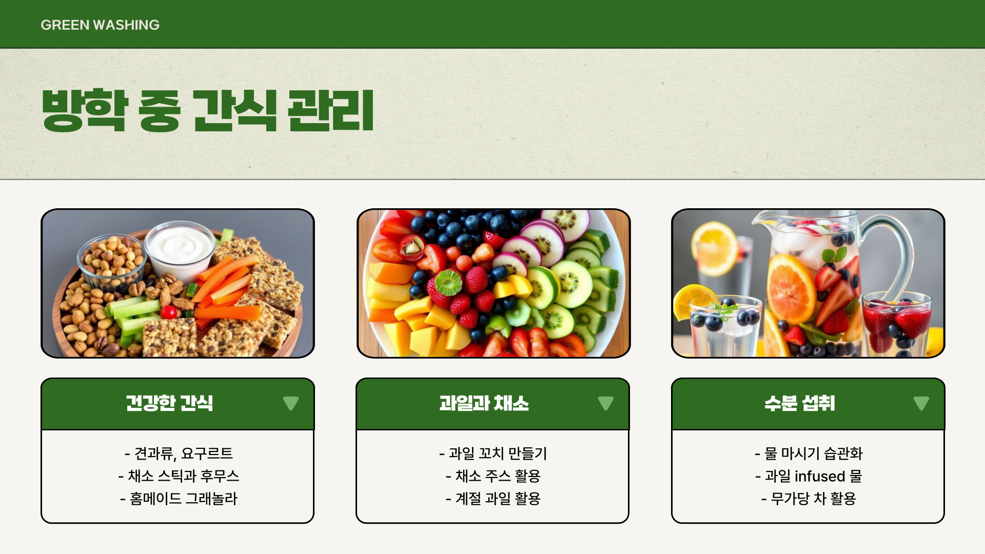 - 건강한 간식과 음료를 선택해주세요.
