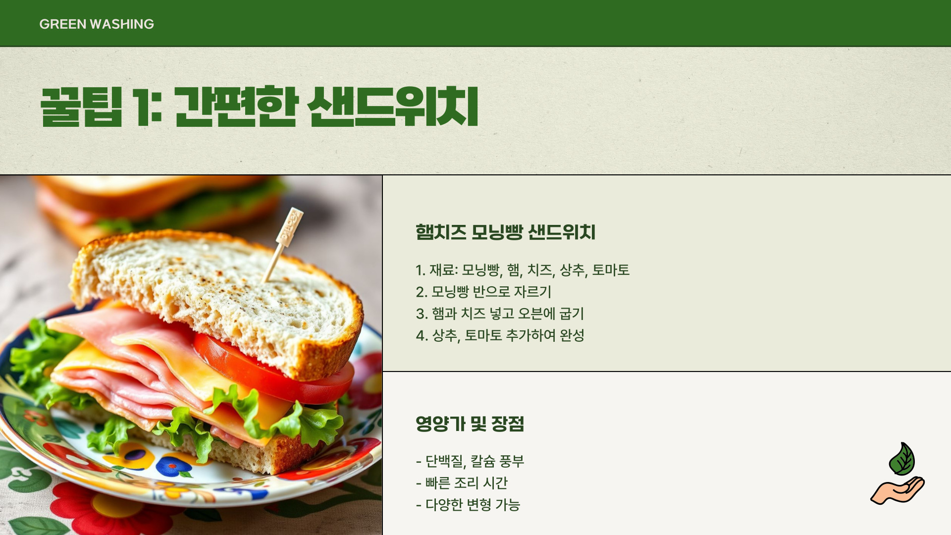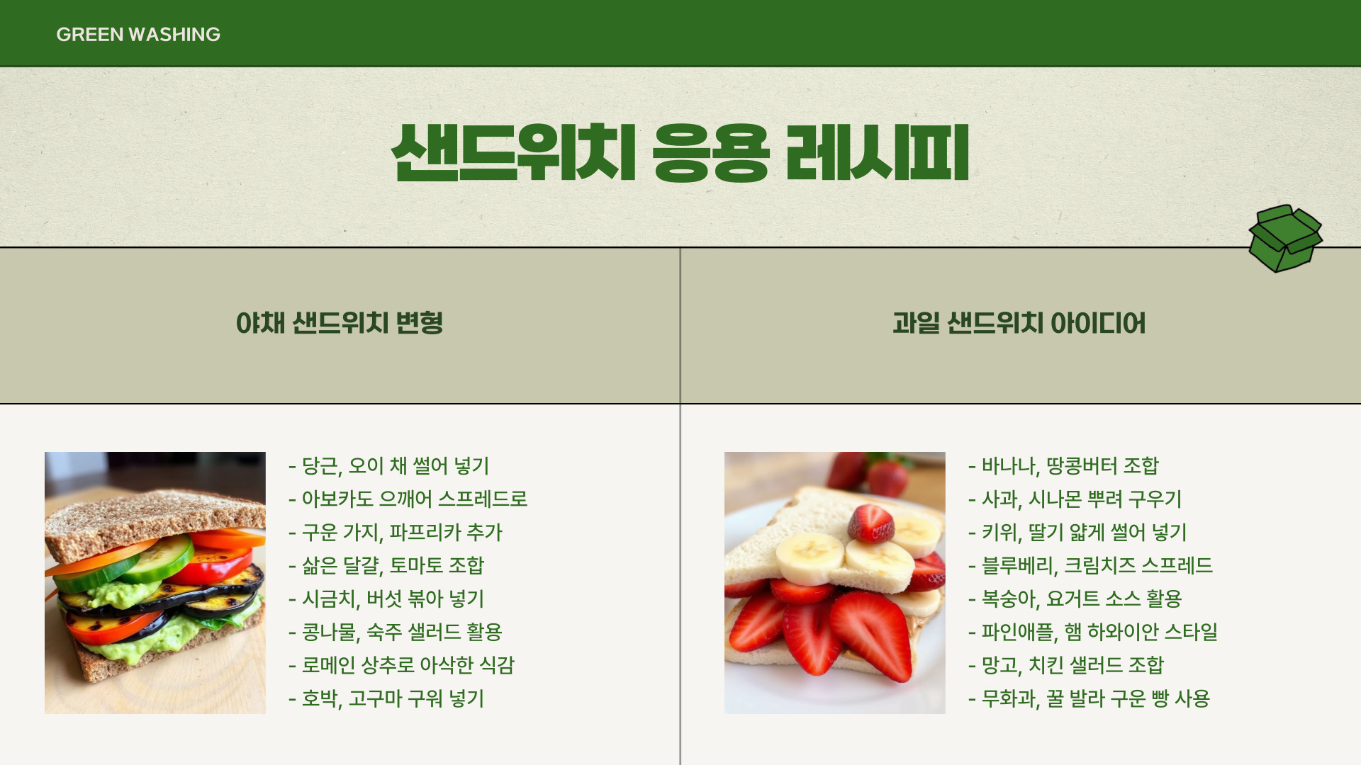 - 샌드위치: 햄, 치즈, 채소
