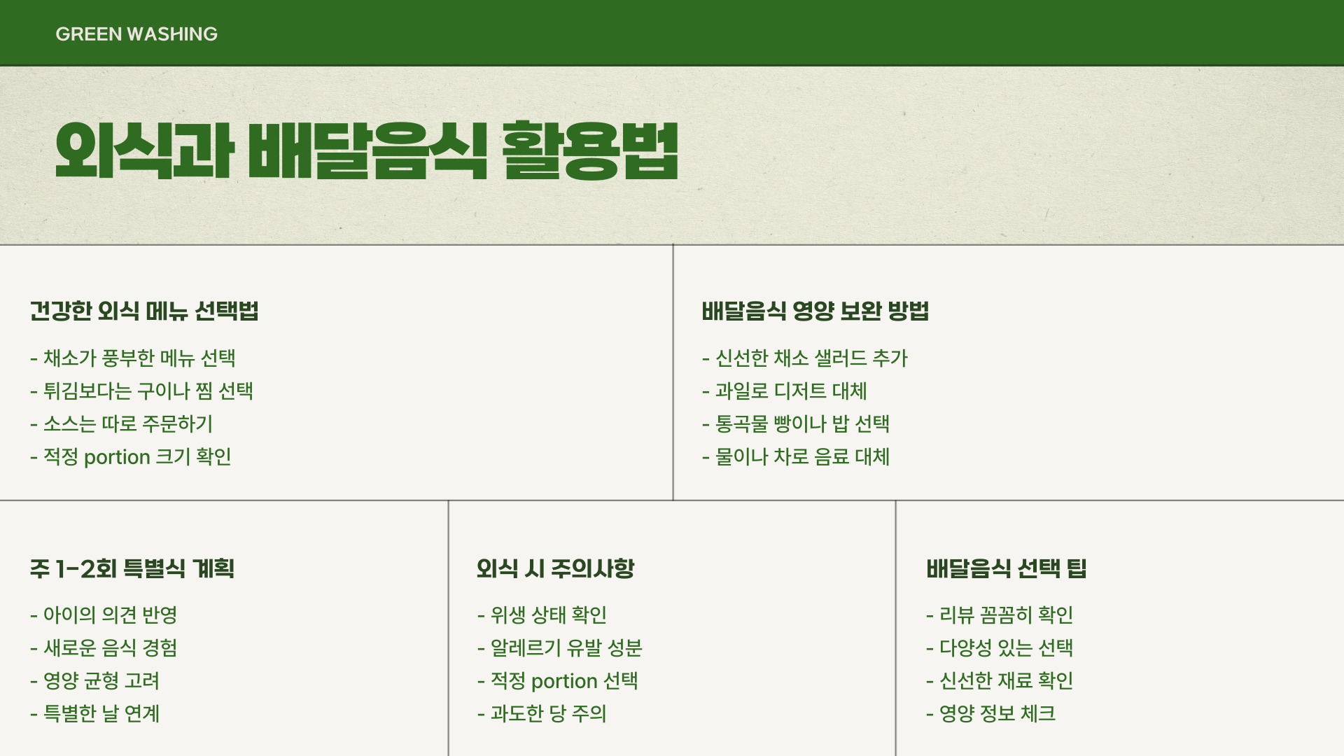 - 다양한 영양소를 포함하는 식사를 계획하세요.