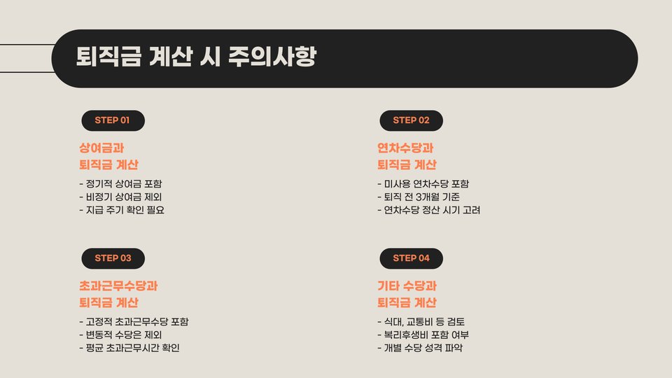 퇴직금을 계산할 때는 몇 가지 주의해야 할 점이 있습니다. 첫 번째로, 법적 기준을 반드시 확인해야 합니다. 근로기준법에 의하면, 퇴직금 지급 기준이 명확하게 정의되어 있으므로 이를 준수하는 것이 중요합니다.