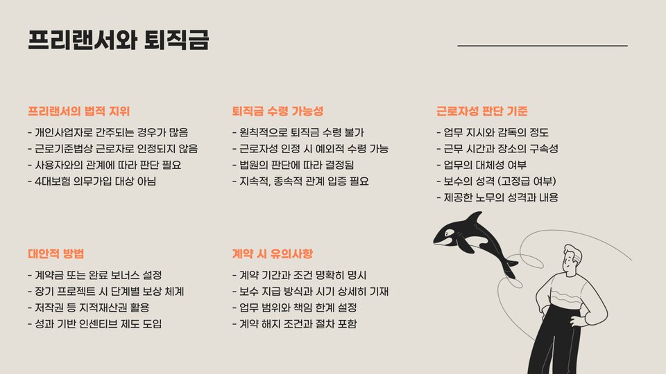 중요 팁: 프리랜서는 계약서에 퇴직금 조항을 포함시키는 것이 좋습니다.