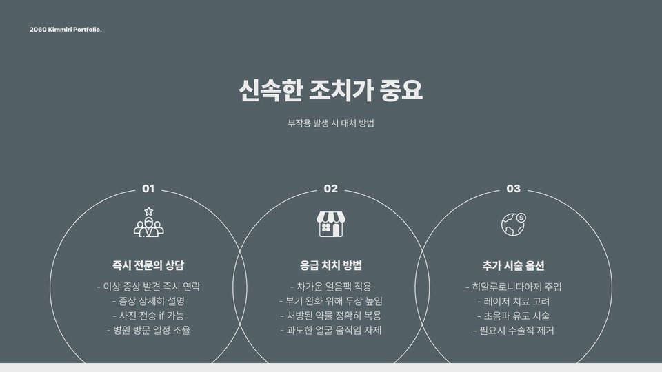 부작용이 발생했을 때는 전문가의 상담을 받는 것이 중요합니다. 피부과 전문의나 성형외과 의사는 개인의 피부 상태와 부작용 정도에 따라 적절한 처치를 제공할 수 있습니다. 또한, 사전에 충분한 상담을 통해 자신에게 맞는 시술 방법을 선택하는 것이 부작용을 줄이는 데 큰 도움이 됩니다.