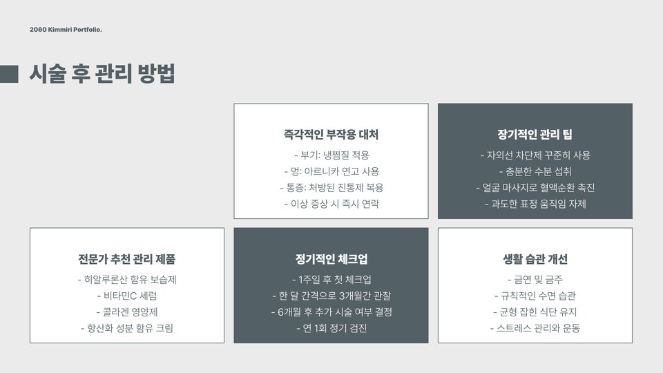 마지막으로, 시술 후의 후속 관리도 전문가와의 상담을 통해 철저히 진행해야 합니다. 주기적인 체크업과 주의사항을 공유받는 것이 향후 부작용을 예방하는 데 큰 도움이 됩니다.