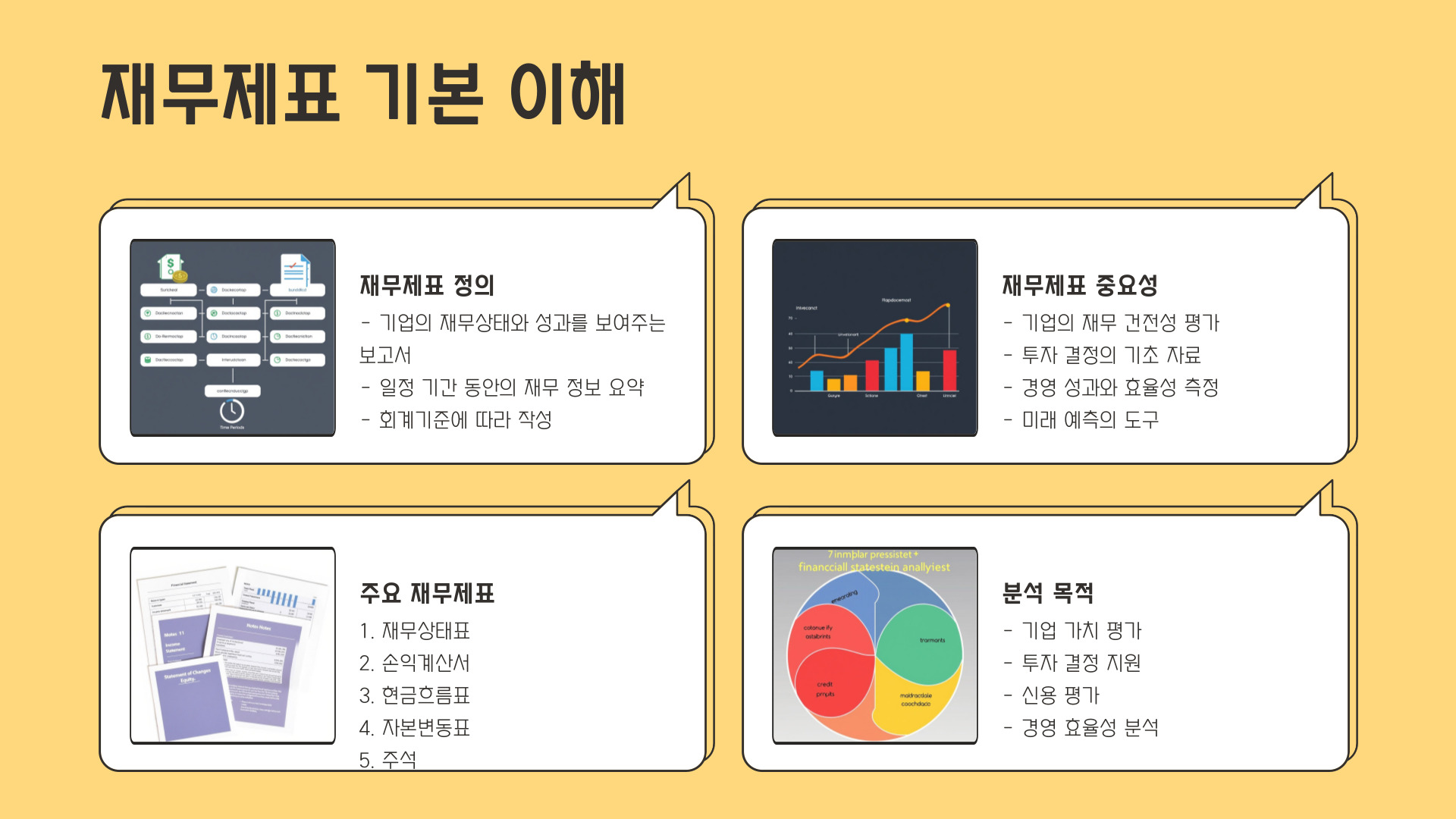 - 재무제표는 재무상태표, 손익계산서, 현금흐름표로 구성됩니다.